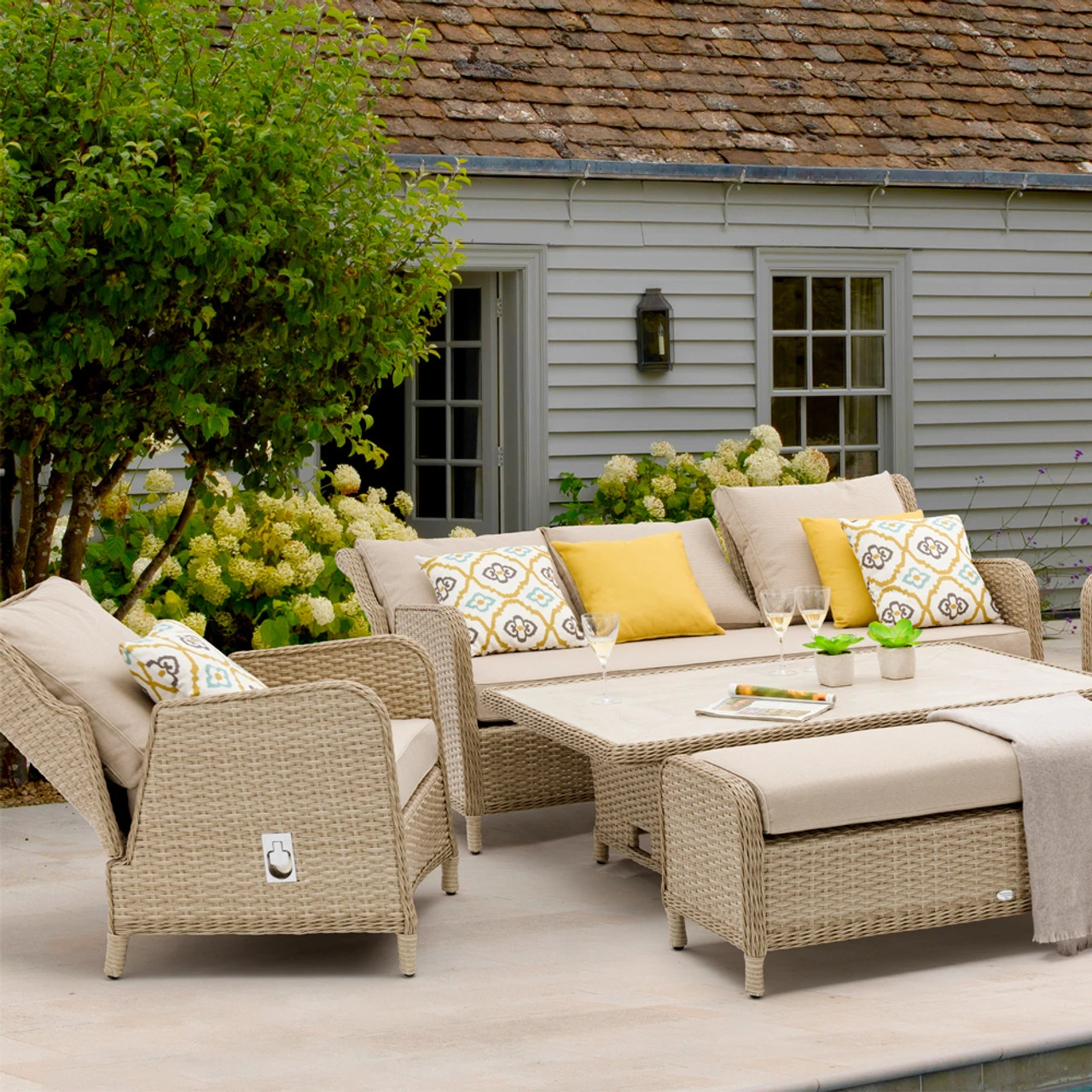 All-weather rattan is built on an aluminium frame, hence the furniture is lightweight and easy to move. Blissfully comfortable, soft-touch cushions are made from season-proof fabric which is water, stain and frost-resistant. The sofa and armchairs feature a smooth reclining mechanism which can lay you back at any angle to suit. The highly durable, ceramic table top is recessed into the weave for added protection and aesthetics. Protect with the Bramblecrest cover set.