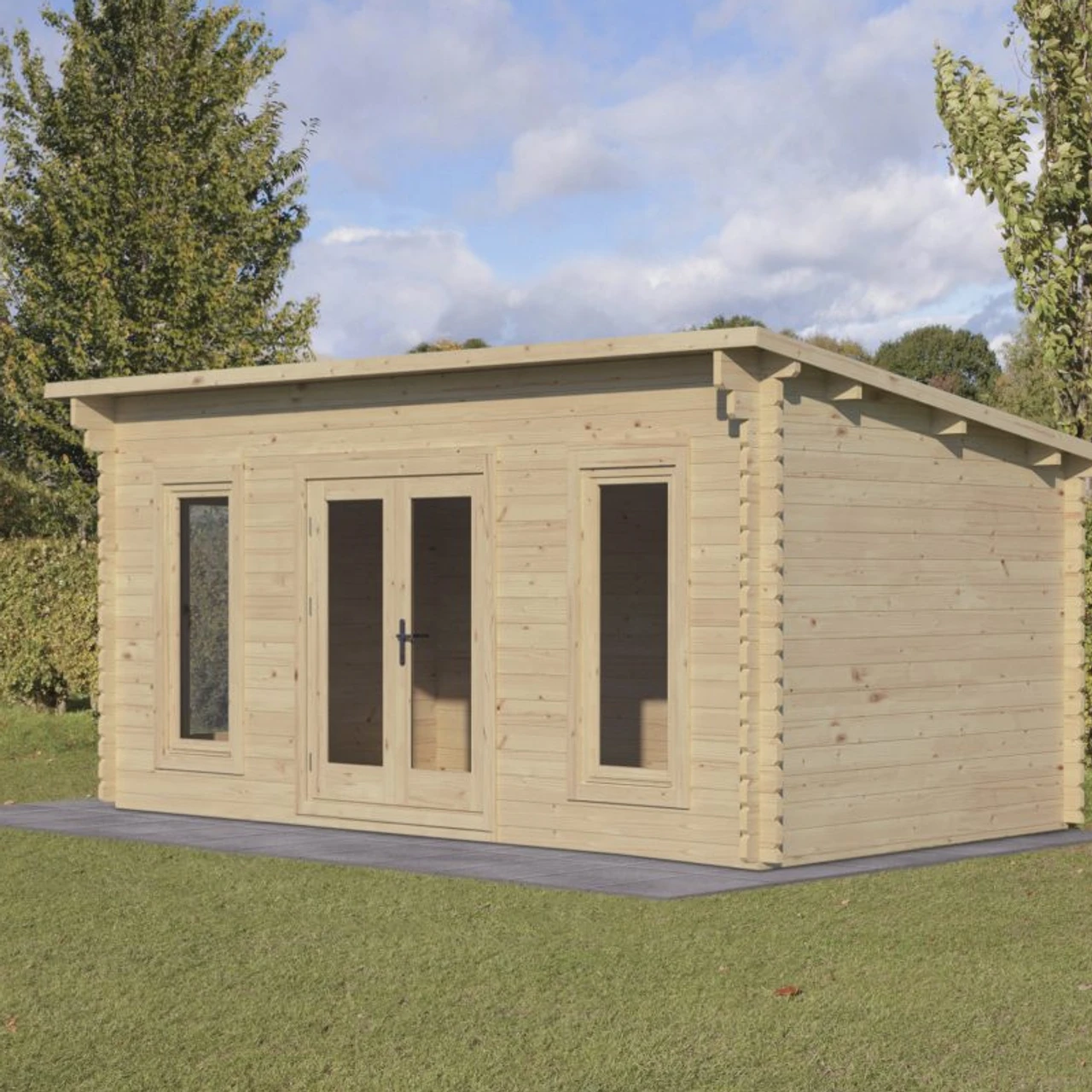 The Elmley is a mid sized Log Cabin with a 5m wide x 3m deep footprint and contemporary pent roof design. It’s impressive specification includes 45mm thick interlocking log walls, 19mm tongue and groove floor and roof, double glazed double doors, two tilt and turn double glazed windows to the front and a 3/4 length double glazed tilt and turn side window that can be positioned in the left or right wall. All windows are double glazed with toughened glass.