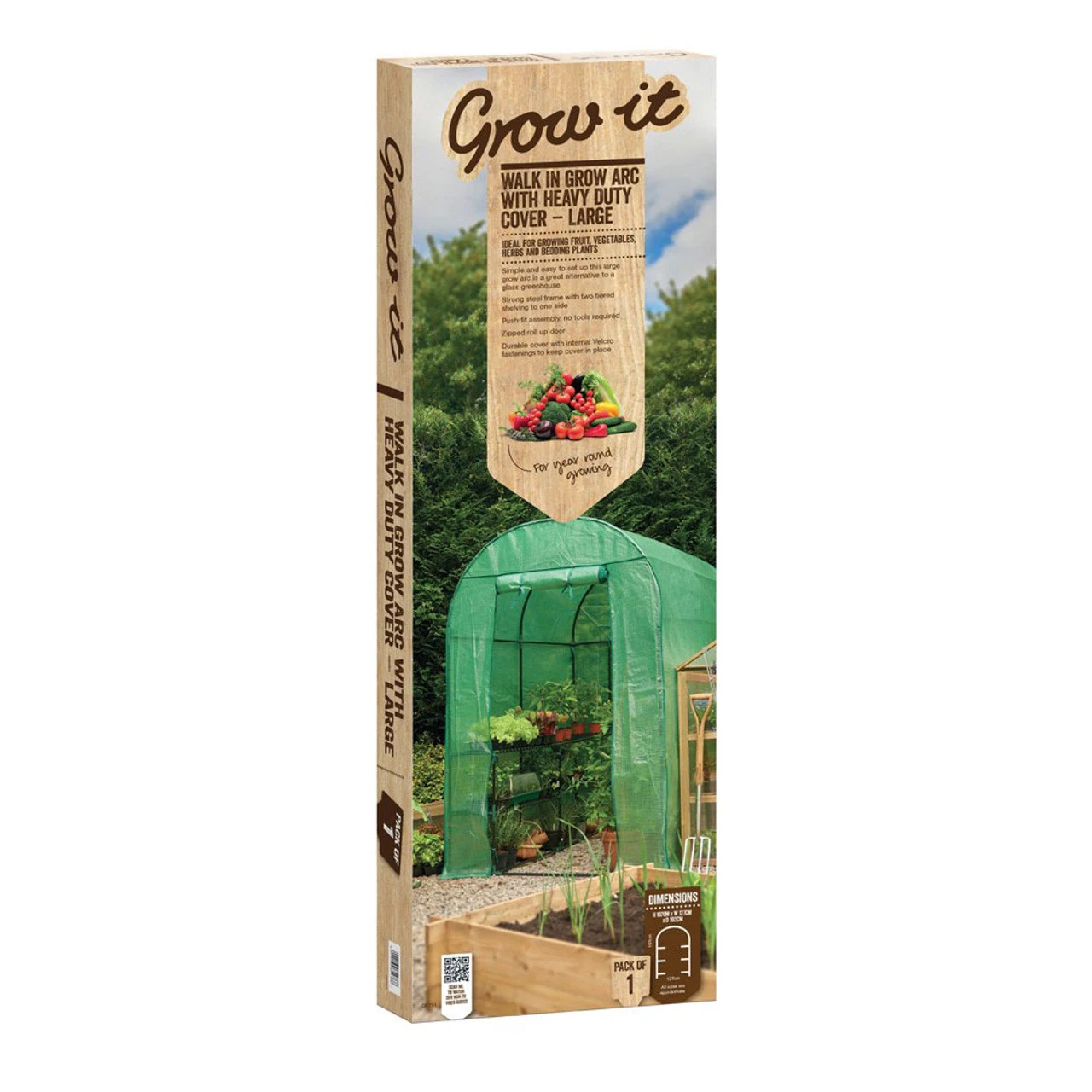 Walk in Grow Arc with Heavy Duty Cover – Large: Specifications: – Simple and easy to set up this large grow arc is a great alternative to a glass greenhouse – Strong steel frame with two tiered shelving to one side – Zipped roll up door – Durable cover with internal Velcro fastenings to keep cover in place Dimensions: H:197cm x W:127cm x D:190cm